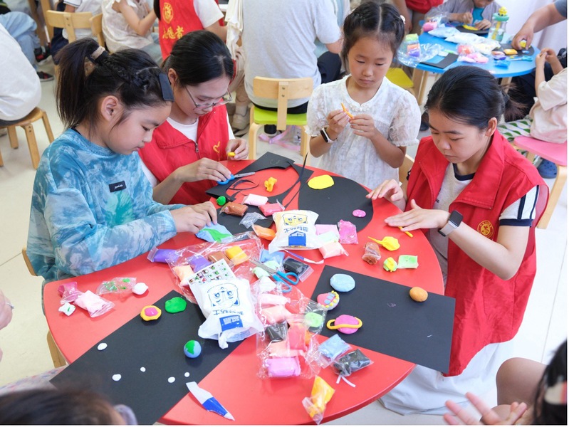 活动最后,志愿者们和孩子们一起完成创意实践环节,孩子们拿起画笔、剪刀、橡皮泥制作“我的航天梦”手工作品。天马行空的想象跃然纸上:腾飞的火箭、璀璨的星辰……一件件稚嫩却充满力量的纸制火箭模型,既是对“两弹一星”精神的致敬,也是对未来科技蓝图的畅想。