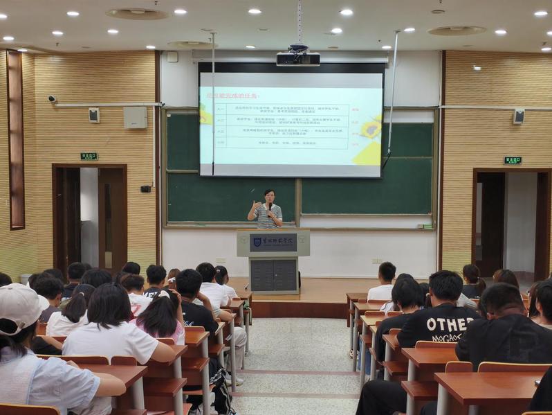 随后,谭瑾老师引导新生们对比大学与高中的学习差异,尽快完成自我调适,确定发展目标和方向。她指出,学习上需从“被动接受固定课程”转向“主动探索专业深度”,聚焦专业核心课程,培养创新与批判性思维;个人成长中,要从“单一学生身份”过渡到“多元社会角色”,在志愿服务、科研创新中塑造价值观;生活里,需学会在“享受孤独”与“有效社交”间找到平衡。在谈及成长路上的助力,她特别分享:班主任能为专业学习答疑解惑,辅导员可在日常困惑中给予指引,他们都是校园里珍贵的“成长伙伴”。