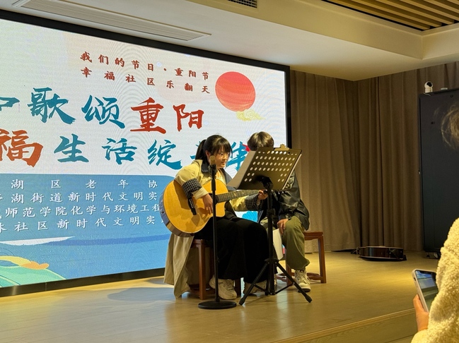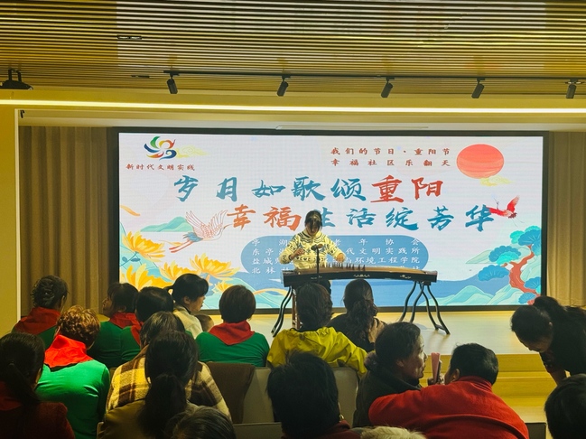10月29日下午,德邻里惠民生党群服务站里乐声悠扬,“岁月如歌颂重阳”主题文艺活动温情上演。盐师化院学子戴子玲、王洁、李耀为社区老人带来了精彩表演:古筝独奏《夕阳红遍小竹楼》旋律婉转,吉他弹唱《当你老了》情真意切。台下的爷爷奶奶听得入神,脸上洋溢着幸福的笑容,热烈的掌声为演出画上圆满句号。