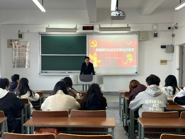 培训中,袁满带领大家深入解读社会主义核心价值观的丰富内涵与核心要义。他指出,价值观是社会的精神灵魂,是人们评判事物重要性的根本标尺,既是驱动社会发展的强大精神动力,更是凝聚人心、汇聚民力的精神纽带。随后,他系统梳理了社会主义核心价值观的历史渊源与发展脉络,强调其植根于中华优秀传统文化沃土,孕育于中国特色社会主义伟大实践,是当代中国精神的集中体现——既清晰勾勒出“富强、民主、文明、和谐”的国家价值目标,明确了“自由、平等、公正、法治”的社会价值取向,更确立了“爱国、敬业、诚信、友善”的公民个人价值准则,三个层面相互贯通、有机统一,共同凝聚社会共识、引领时代风尚。活动最后,他就“如何践行”给出具体指引,鼓励入党积极分子坚持知行合一,将核心价值观深度融入学习、工作与生活的方方面面,真正做到内化于心、外化于行。