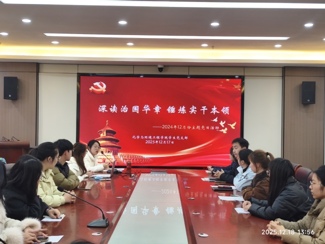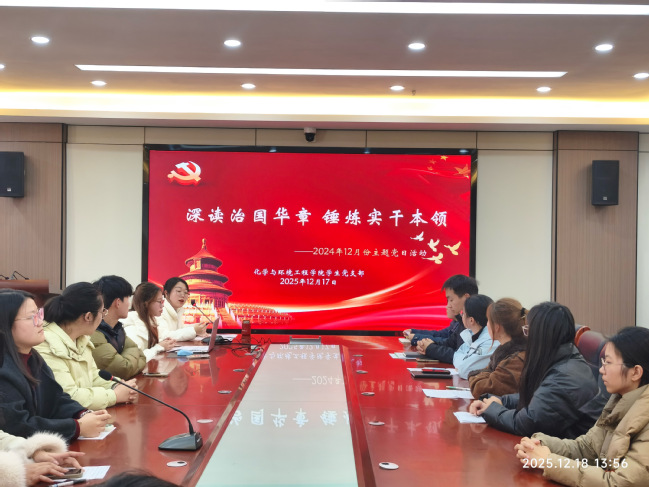 为推动理论学习与实践工作深度融合,实现以学促干、以干践学的良性循环,2025年12月17日,化学与环境工程学院学生党支部开展“深读治国华章,锤炼实干本领”专题学习活动。活动聚焦重要会议精神开展系统性学习,引导全体党员准确把握精神实质、汲取奋进力量,切实以理论学习赋能发展实践,让党的创新理论在大学校园焕发蓬勃生机。