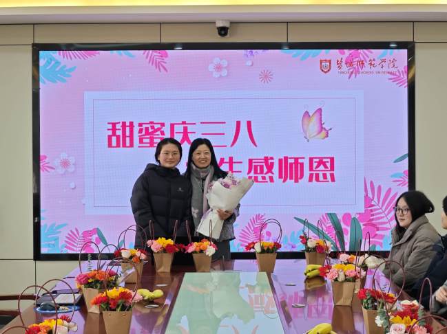 随后,活动进入“甜蜜庆三八,学生感师恩”环节。同学们怀着感恩之心,为学院女教职工献上精心准备的节日鲜花和真挚祝福,用朴素而温暖的方式,感谢女老师们长期以来在教育教学、学生培养中的辛勤付出与无私奉献,感恩她们以榜样的力量,激励每一位学生勇敢追梦、奋力成长,现场氛围温馨而热烈。